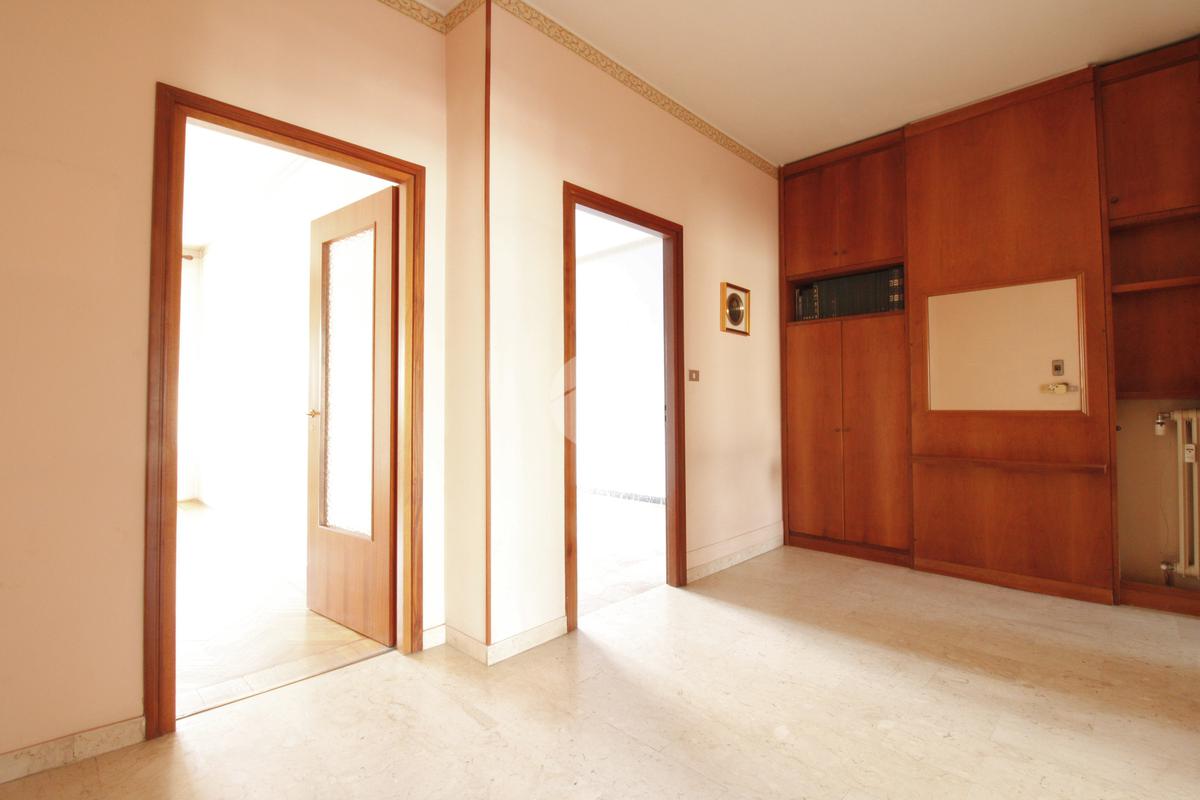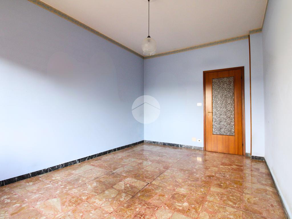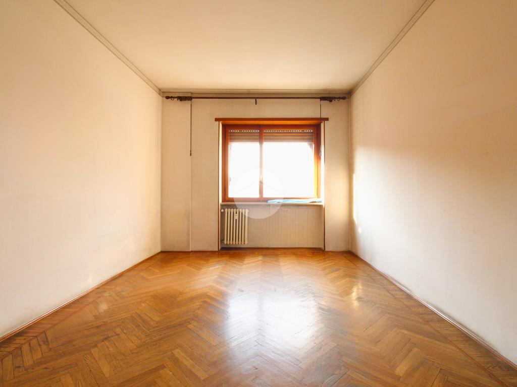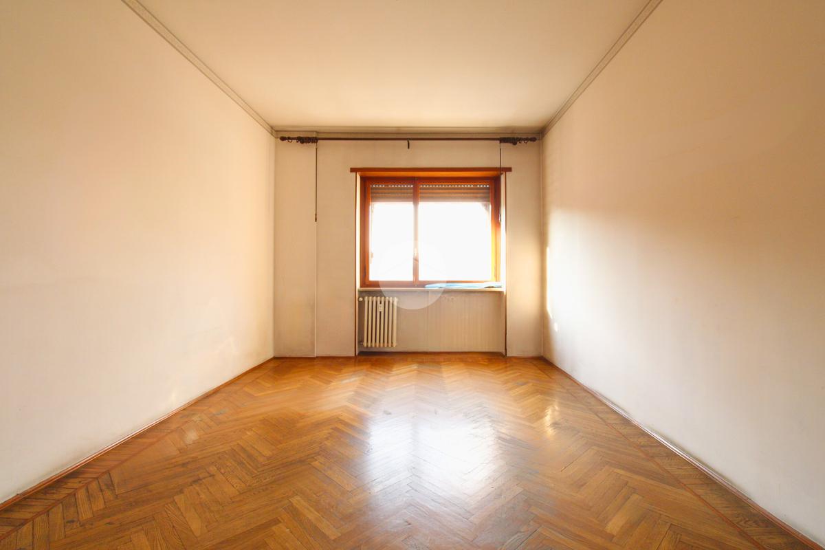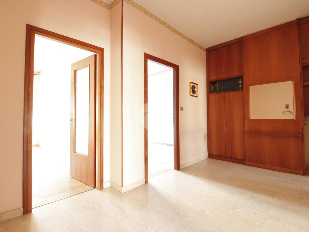 L'appartamento è composto da un generoso ingresso sfruttabile, un ampio soggiorno con possibilità di realizzare un moderno ambiente living, cucinino lineare con finestra, due grandi camere da letto con affaccio sulla via esterna — una delle quali facilmente adattabile a studio o cabina armadio —, servizi, ripostiglio e cantina al piano interrato.